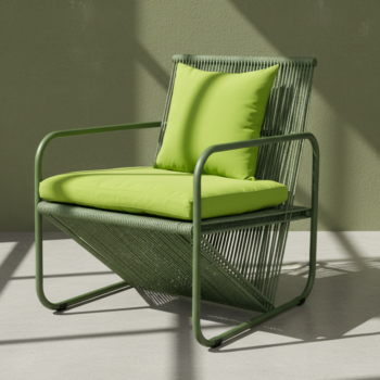 This modern geometric woven armchair features a calming sage green frame that weaves unique architectural lines; paired with vibrant lime colorful cushions, it seems to perfectly blend the tender buds of early spring with the tranquility of a forest into a single chair.