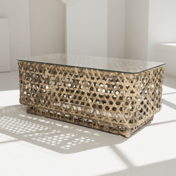 Infuse your home with a resort-like sense of comfort and elegance. This side table features the same hand-woven hexagonal perforation technique as the chairs in the collection, combined with a clear tempered glass top panel, showcasing the warmth of craftsmanship while maintaining the sleek quality needed in modern urban living.